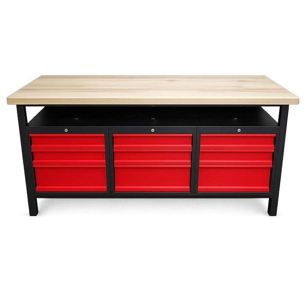 The unit features nine spacious drawers organized into three locking sections, providing secure storage for a vast array of tools and hardware. The striking red drawer fronts provide high visibility and a clean, modern aesthetic. With its unique open-access middle shelf situated between the solid wood top and the drawer units, this bench is designed to maximize efficiency by keeping frequently used items within reach while maintaining a clutter-free work surface. The heavy-duty steel legs provide a rock-solid foundation capable of supporting heavy machinery and high-impact projects.